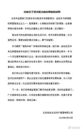 人民网北京8月23日电(丁亦鑫)8月23日,自如通过官微发布关于坚决配合政府调查的说明称,北京市监管部门日前发布对租赁市场调查情况,自如作为被调查的房屋租赁企业之一,高度重视、认真配合政府部门的调查,全面接受相关查处结果,并将在此基础上进行深度自查、坚决整改。