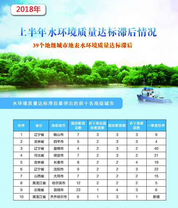 其中,达标滞后情况最突出的10个城市为鞍山、四平、盘锦、保定、长春、沈阳、大同、哈尔滨、昆明、齐齐哈尔。此外,齐齐哈尔、唐山、沧州、七台河、通辽、德阳、黔东南、玉溪等8个市(州)因第二季度水质变差加入名单。