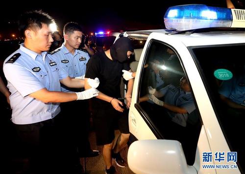 8月29日,在浦东国际机场,民警将犯罪嫌疑人朱某某押上警车带离。新华社记者凡军摄