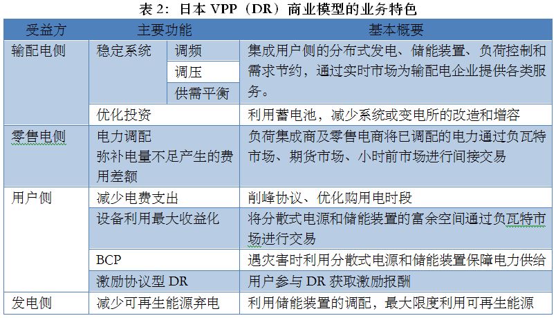 家庭包括空调和照明设备等,企业包括空调、通风设备、风扇、压缩机、冷却器、水泵等。日本推广VPP(DR)的重点集中在住宅、办公大楼、工厂、商业设施、公共事业和电动汽车等六大领域,以“光伏+储能”为主要形式,表2列举了日本VPP(DR)商业模式的主要业务特色。