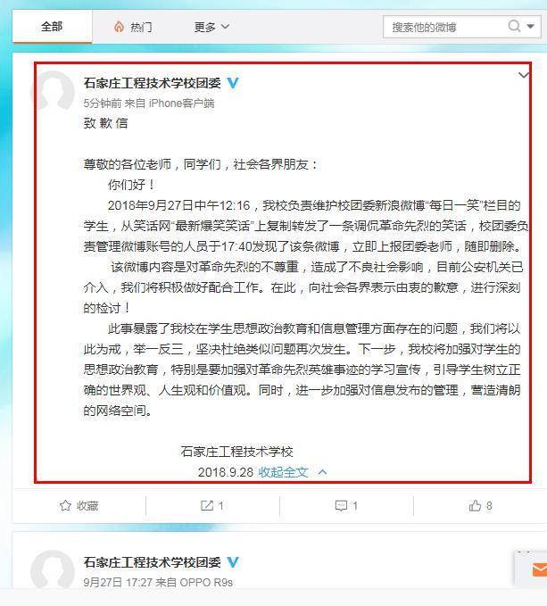 稍后,石家庄工程技术学校通过官方微博发布了致歉信:我校负责维护校团委新浪微博“每日一笑”栏目的学生,从笑话网“最新爆笑笑话”上复制转发了一条调侃革命先烈的笑话,校团委负责管理微博账号的人员于17:40发现了该条微博,立即上报团委老师,随即删除。