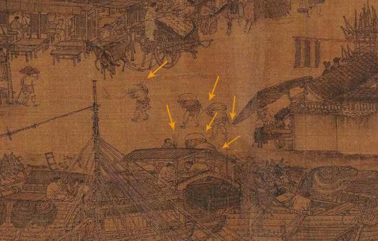 在汴河的一个码头上,码头上有几位搬运工,他们手里拿着像木棍一样的东西,实际上,搬运工人们手里拿的东西不是木棍,是竹签。这是古代计件工资的一种形式——从码头上把粮食卸下来之后运到粮仓里,在这里领一根竹签,可以换一份工钱。