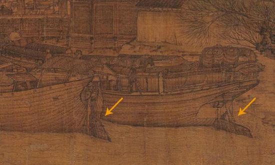 可以看到上面有悬挂的舵链,赋予了舵可升降的功能。当汴河水浅的时候,舵就可以提升上去,如果不提升上去,舵插到下面的话,就会改变航向、妨碍航行。