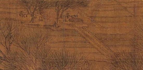 放大一些看,菜园子旁的圆口井上,有一柄辘轳,在圆口井的上方,有很小的一个东西,是辘轳(lù lu)。旁边有个人似乎是要提水,而且在他左侧的一方,有一个人挑着一个担子,应该是已经汲水而去了。