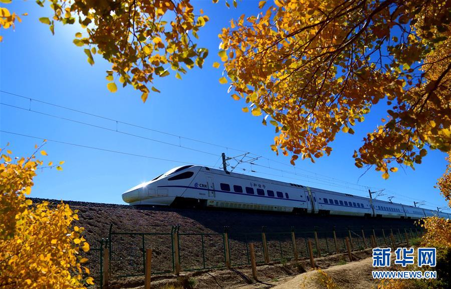 10月6日,一列动车从甘肃省敦煌市莫高镇的胡杨林旁驶过。 新华社发(张晓亮 摄)