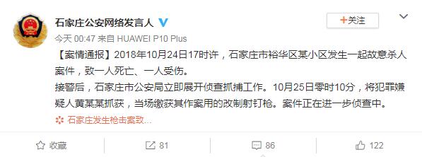 人民网北京10月25日电 据河北石家庄市公安局官方微博消息,2018年10月24日17时许,石家庄市裕华区某小区发生一起故意杀人案件,致一人死亡、一人受伤。