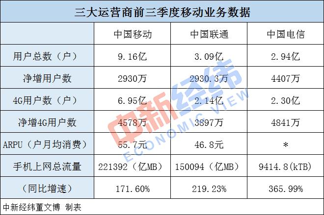 三大运营商财报显示,截至9月底,中国移动用户达9.16亿户,其中4G用户数6.98亿户,净增4578万户;中国联通用户达3.09亿户,4G用户数2.14亿户,净增3897万户;中国电信移动用户数达到2.94亿户,4G用户数2.30亿户,净增4841万户,增量居首位。