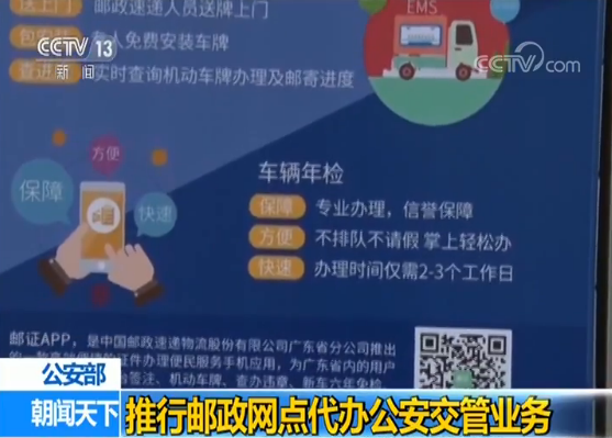 央视网消息:近日,公安部、国家邮政局、中国邮政集团公司在江苏、浙江、广东、四川等地进行试点的基础上,部署推行邮政网点代办公安交管业务。邮政网点今后可提供机动车业务、驾驶证业务、交通违法自助处理、互联网平台用户注册等四大类25项交管业务的代办服务。