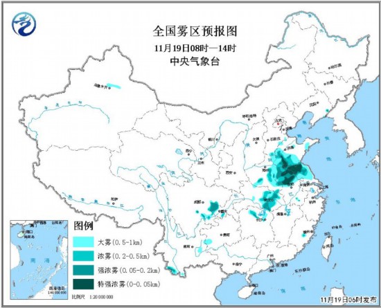 预计,11月19日早晨至上午,山东西部、河南中东部、安徽中北部、江苏中北部、湖北中东部、四川盆地中部等地有大雾,其中山东西南部、安徽北部、江苏北部等地的部分地区有能见度不足50米的特强浓雾。