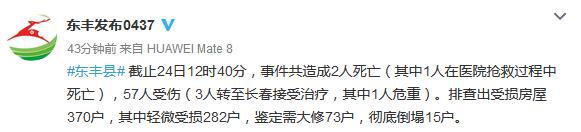 据吉林省东丰县互联网信息中心官方微博“东丰发布0437”消息, 11月23日23点40分左右,三合乡永安村三组吉林省江城机械公司发生爆炸并引起火灾。截至24日12时40分,事件共造成2人死亡(其中1人在医院抢救过程中死亡),57人受伤(3人转至长春接受治疗,其中1人危重)。