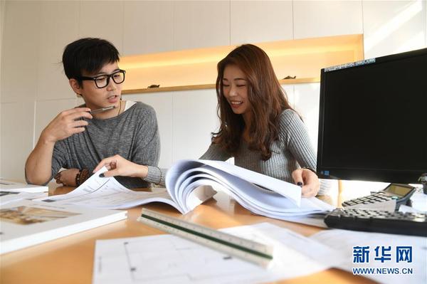 12月2日,沈宗贤(左)和他的助理在厦门思明区启达海峡双创基地工作室探讨设计方案。台湾青年沈宗贤14岁留学英国,大学毕业后玩了两年,一直找不到方向。沈宗贤回忆说:“一觉睡醒,感到自己要做出点成绩。”他离开英国,回到大陆,翻开了人生新的一页。新华社记者 林善传 摄