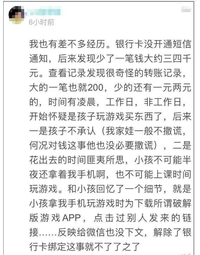 当时手机静音的,12点多是平常睡觉的时间,当晚一直很乖的女儿反复哭闹,朋友想去拿手机看看时间才发现的短信提醒,幸好发现的及时,卡里的钱没被转完。朋友说发现之后重新登录微信,还一直被强制下线!对方还在操作。