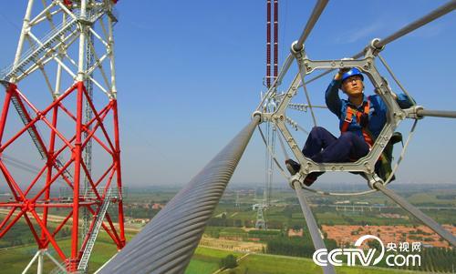央视网消息:在1000千伏特高压交流输变电山东段,王进带领工友们进行通电前的最后验收。从地面到塔顶接近60层楼的高度,王进要借助于886根攀爬脚钉,徒手攀爬上去。