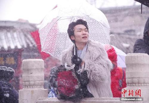 2月14日,北京迎来今年第三场降雪,一男子手持玫瑰花在雪中等人。中新社记者 贾天勇 摄