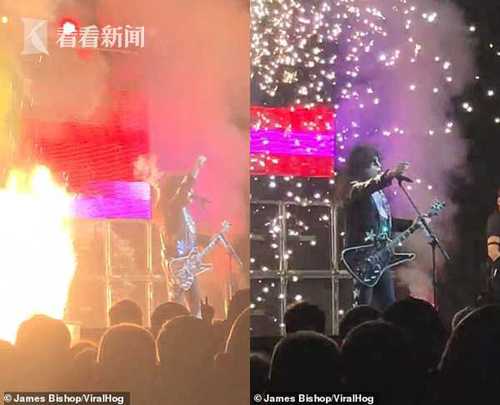 原标题:舞台上头发被焰火点燃 摇滚歌手淡定继续唱