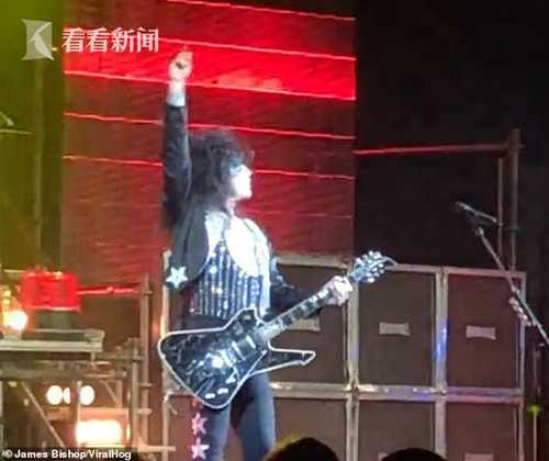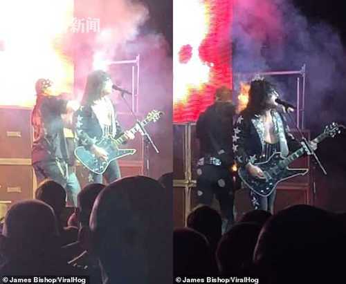 这支名叫KISS tribute的摇滚乐队近日在美国爱荷华州苏城举办演唱会,主唱詹森的头发突然被舞台上喷出的氛围焰火点燃,乐队的另一名成员见状试图扑灭火焰,随后又示意台下的工作人员上来帮忙。