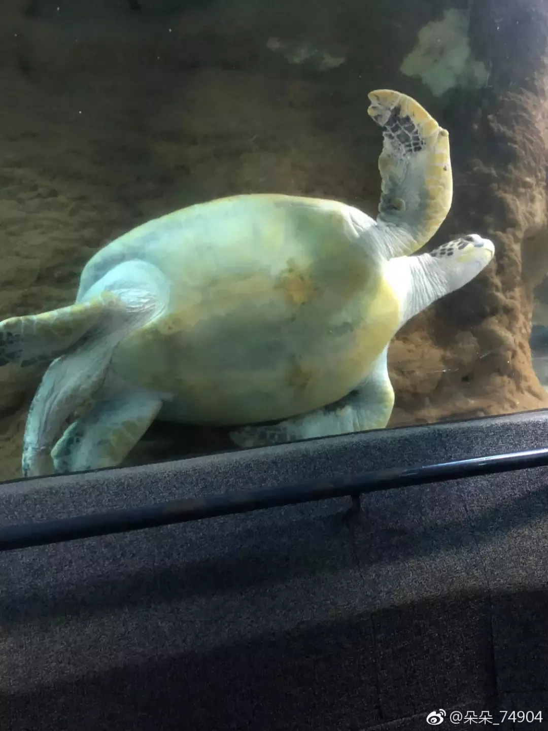 “来大连八年了,第一次去圣亚海洋世界大约是在5年前。走海底隧道时就发现不远处右侧玻璃壁那紧贴着这只海龟。当时跟身边人讨论,它是不是卡在这不能动了,朋友都说我多心了。去年带孩子去圣亚,又一次看到这个场景,我再一次提出这只海龟卡在这儿了……周围游客哈哈大笑,都说是我想多了。时隔一年,今天第三次看到它依然在这……一只海龟的寿命本来就很长,忍受着孤独,寂寞在那卡了这么多年,该有多绝望。”
