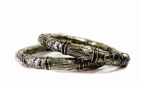 手镯按制作材料可分为金手镯、银手镯、玉手镯、镶宝石手镯等。按结构一般可分为两种:一是封闭形圆环,以玉石材料为多;二是有端口或数个链片,以金属材料居多。这副银手镯(见图)内径约5、粗约1厘米,重约40克。一般空心卷皮手镯的焊缝多设置在内壁,唯此镯焊缝被大胆地留置于镯背正面,而焊接得异常牢固严密,显示了工匠的精湛技艺和信心,故使其历经数百年水土侵蚀而不憋不漏。手镯里面的响砂干爽利落、声音清脆。贴花工艺的老银镯已不多见,而此镯的表面浮雕着简洁的圆条竹节纹,满身掐丝贴焊竹叶和梅花,寓意诸事(竹事)美(梅)满。