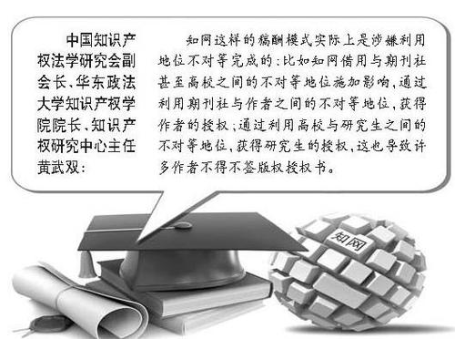 中国知识产权法学研究会副会长、华东政法大学知识产权学院院长、知识产权研究中心主任黄武双告诉记者,知网这样的稿酬模式实际上是涉嫌利用地位不对等完成的:比如知网借用与期刊社甚至高校之间的不对等地位施加影响,通过利用期刊社与作者之间的不对等地位,获得作者的授权;通过利用高校与研究生之间的不对等地位,获得研究生的授权,这也导致许多作者不得不签版权授权书。