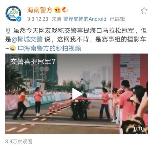 有部分网友称,撞线的摩托车是交警的引导车,对此海南省公安厅通过官方微博进行了辟谣,“虽然今天网友戏称交警喜提海口马拉松冠军,但是@椰城交警说,这锅我不背,是赛事组的摄影车~”