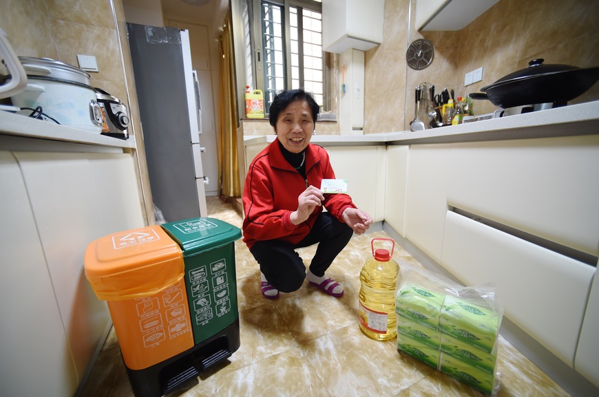 福建省厦门市垃圾分类示范小区天湖城小区住户邱彩仙展示记录垃圾分类积分的“智慧环卫绿卡”和用积分换取的食用油、纸巾等物品(2017年3月29日摄)。新华社记者姜克红摄