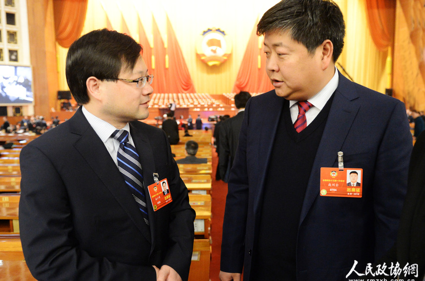 3月3日,中国人民政治协商会议第十三届全国委员会第一次会议在北京人民大会堂开幕。这是施小明委员与敖刘全委员在一起亲切交谈。人民政协报●人民政协网记者 贾宁 摄