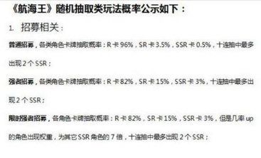 在《航海王:燃烧意志》官方公布的随机抽取类玩法概率公布中显示,“限定招募”活动中,SSR卡牌抽取概率为3%,新角色的权重增加,为其他SSR角色的7倍。但是玩家300次抽不到新角色的现象并不少见,官方公布的概率如何验证与监督目前还是一个待解决的问题。