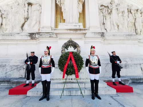 当天中午,在总统府的活动结束后,习主席驱车前往威尼斯广场,向意大利祖国祭坛的无名烈士纪念碑献花圈。