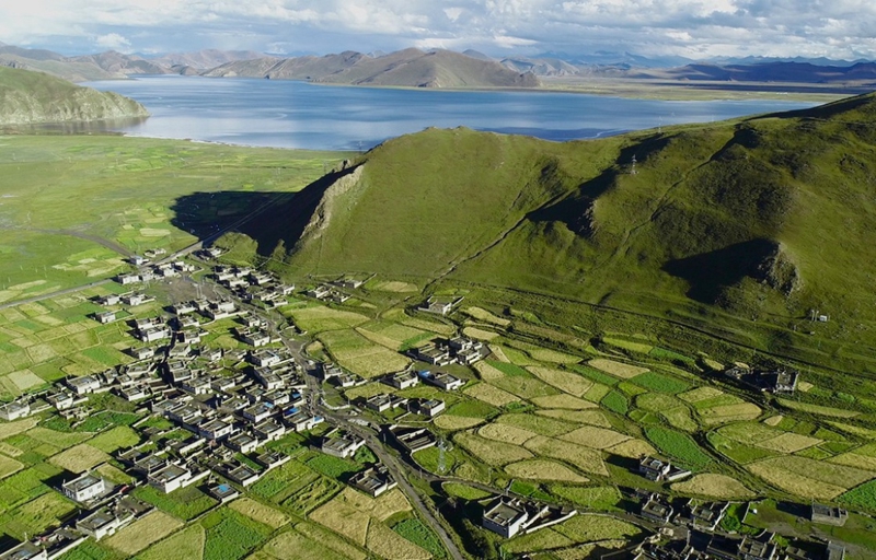 羊卓雍错湖边的乡村(2018年9月13日无人机拍摄)。当前西藏高原各类生态系统结构整体稳定,气、声、水、土壤、辐射及生态环境质量均保持在良好状态,大部分区域仍处于原生状态,西藏仍然是世界上生态环境最好的地区之一。新华社记者 普布扎西 摄