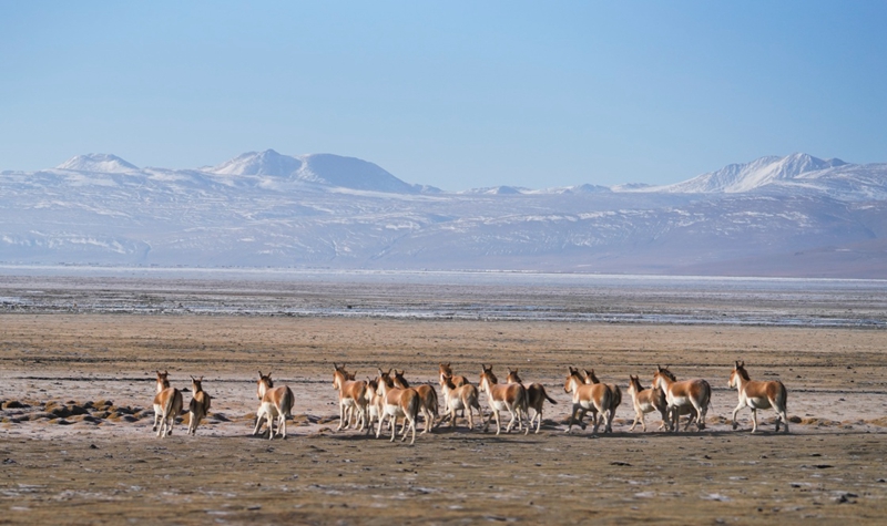 西藏哲古草原上奔跑的藏野驴(2019年3月17日摄)。当前西藏高原各类生态系统结构整体稳定,气、声、水、土壤、辐射及生态环境质量均保持在良好状态,大部分区域仍处于原生状态,西藏仍然是世界上生态环境最好的地区之一。新华社记者 张汝锋 摄
