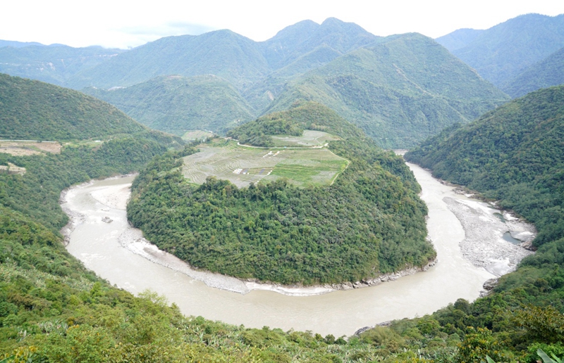 西藏墨脱县雅鲁藏布江果果塘大拐弯(2018年5月6日摄)。当前西藏高原各类生态系统结构整体稳定,气、声、水、土壤、辐射及生态环境质量均保持在良好状态,大部分区域仍处于原生状态,西藏仍然是世界上生态环境最好的地区之一。新华社记者 晋美多吉 摄