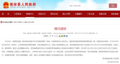 通报称,3月26日,有媒体报道“贵州瓮安校园少年互杀案再调查”新闻,引起网民和社会的关注。该新闻中提到的陈某某故意伤害一案,瓮安县人民法院经依法审理,于2014年10月28日作出一审判决,认定陈某某犯故意伤害罪,判处有期徒刑八年。被告人陈某某提出上诉,贵州省黔南州中级人民法院于2015年1月22日作出终审裁定,驳回上诉,维持原判。被告人近亲属提出申诉,贵州省黔南州中级人民法院和贵州省高级人民法院对全案进行了复查,并分别于2015年12月21日和2018年12月27日驳回申诉。