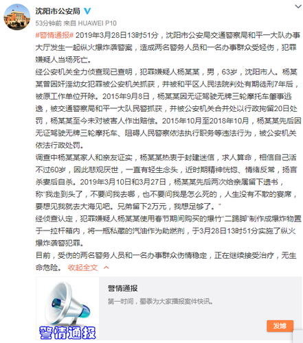 央视网消息:2019年3月28日13时51分,沈阳市公安局交通警察局和平一大队办事大厅发生一起纵火爆炸袭警案,造成两名警务人员和一名办事群众受轻伤,犯罪嫌疑人当场死亡。