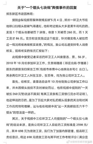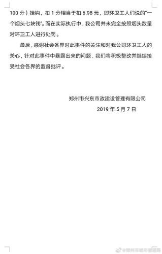 新京报快讯 据郑州市城市管理局官方微博消息,5月7日,郑州市兴东市政建设管理有限公司针对网友近期特别关注的“发现一个烟头扣环卫工人七块钱"的舆情事件的调查回复(见附图)。5月8日,郑州市城市管理局官方微博发布对于该公司的回复,郑州市城市管理局环卫处薛芳礼处长指出郑州市目前执行的环卫职工工资标准2598元/月里面,按规定只能有450元作为绩效工资,且最低发放数额不能少于300元,即扣除部分最多不能超过150元。而该公司将其中698元作为绩效工资属于违规行为,已责令郑东新区市政园林局督促该公司马上整改,并安排各区环卫主管部门核查自己辖区是否存在类似违规情况。