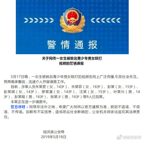 广东陆河县政府官方微博@陆河发布5月18日发布陆河县公安局的通报称,5月17日晚,一女生被数名青少年男女殴打的视频在网上广泛传播,引发社会关注。陆河县公安局高度重视,迅速介入开展调查工作。