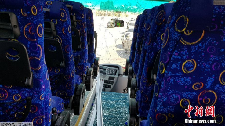 当地时间5月19日,埃及吉萨金字塔附近受袭大巴车厢里玻璃碎片满地。