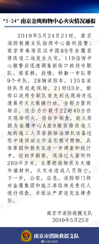 新京报快讯 据南京消防微博25日通报,南京金鹰购物中心起火原因为施工人员违规动火作业。以下为通报详情: