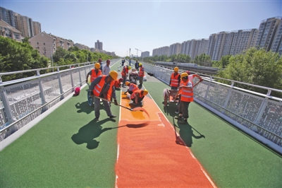 5月23日,北京市政路桥养护集团施工人员铺装自行车专用路彩色面层。新京报记者 王贵彬 摄