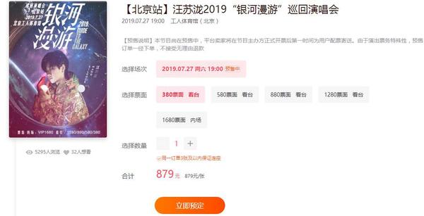 除此之外,中新经纬还发现,宣称“90%演出都打折”的摩天轮平台上部分演出票价比票面价格高出不少。如正在预售的汪苏泷巡回演唱会门票,其票面价格为380元的商品售价为879元,是票面价格的两倍多。而林宥嘉演唱会的一档看台票,也出现了实际价格比票面价格高60%的情况。