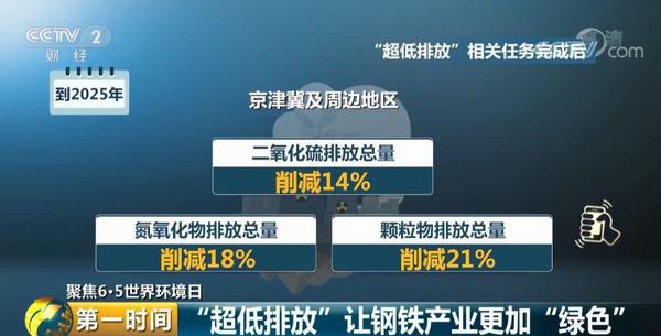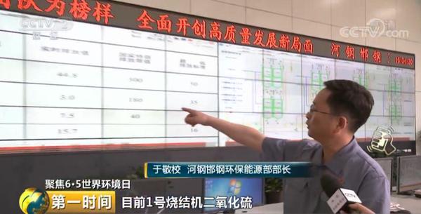 河钢邯钢环保能源部部长 于敬校:比如二氧化硫,目前1号烧结机二氧化硫入口排放是1100多毫克/标准立方米,实时排放是3.0毫克/标准立方米。目前国家标准是180毫克/标准立方米,超低排放标准是35毫克/标准立方米,我们的水平已经达到了国家超低排放的标准。