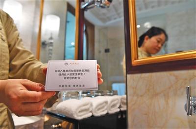 昨日,北京人卫酒店,保洁员将环保提示牌放置在卫生间。