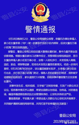 澎湃新闻从菏泽市曹县公安局官方微博获悉,6月18日晚,曹县公安局接警称,磐石办事处幸福人家小区女童李某(9岁)被一名蒙面歹徒在小区内绑架,后该女童在万基小区南门附近自救逃脱。
