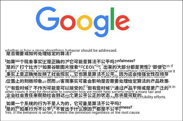 该文件还详细表述了谷歌所谓“算法不公平”概念,意思就是当某些事实被认为是不公平的(比如性别歧视、种族歧视等),“我们可能需要考虑如何通过产品干预帮助社会达到更公平和公正的状态。”