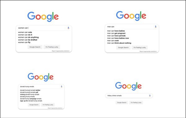对此,“真理计划”提供了一系列截图,显示搜索“希拉里·克林顿邮件”时出现的建议,或者搜索“女性可以”和“男性可以”时出现的不同建议。