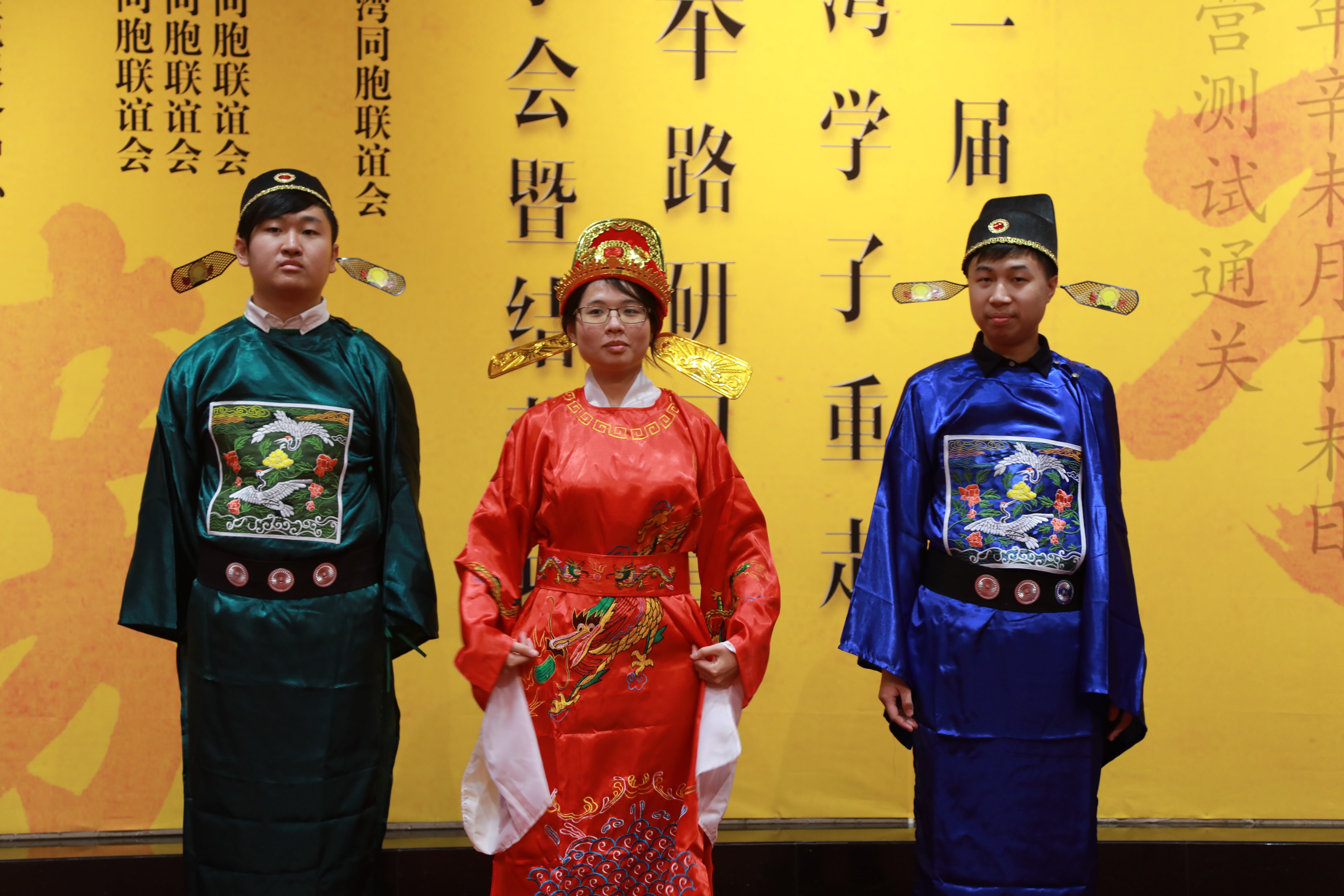 状元怯凯晴、榜眼邱健智、探花马超身着红袍礼服,上台领受高中金榜的“捷报”。在喜悦的音乐声中,第二届“台湾学子重走科举路研习营”活动圆满结营。
