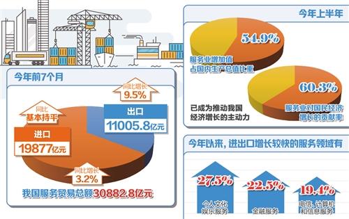 商务部9月4日发布的最新数据显示,今年1月份至7月份,我国服务贸易总额达到30882.8亿元,同比增长3.2%。其中,出口11005.8亿元,同比增长9.5%;进口19877亿元,同比基本持平。