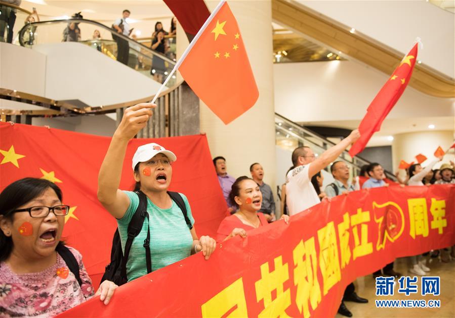 9月24日,一场爱国快闪活动在香港太古广场举行。大批香港市民高唱爱国歌曲,庆祝中华人民共和国成立70周年。 新华社记者 翁忻旸 摄