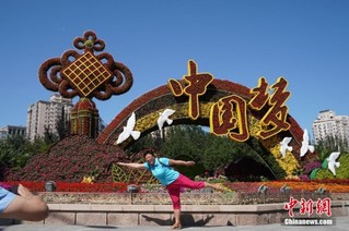 9月24日,市民在位于复兴门东北角的“美好明天”主题花坛前拍照留念。随着国庆节临近,北京街头主题花坛陆续亮相。中新社记者 张兴龙 摄