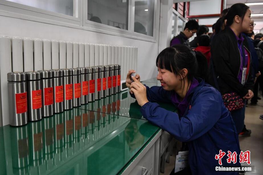 10月6日,香港各界青少年访京团一行参访天安门国旗护卫队。据悉,访京团由来自香港青少年军总会、香港少年领袖团、香港交通安全队、香港童军总会、香港升旗队总会等多个香港制服团体的青少年组成。访京团团员在参访的同时,还参加“国旗下话成长”交流分享会,与部分全国及北京青联委员、国旗护卫队战士进行交流。图为访京团小团员拍摄国旗护卫队战士的水壶。 中新社记者 崔楠 摄