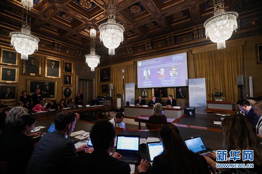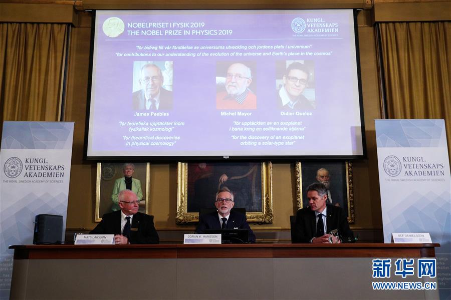 10月8日,在瑞典斯德哥尔摩,瑞典皇家科学院公布2019年诺贝尔物理学奖获得者。 瑞典皇家科学院8日宣布,将2019年诺贝尔物理学奖授予三名科学家。来自美国的詹姆斯·皮布尔斯因宇宙学相关研究获奖,来自瑞士的米歇尔·马约尔和迪迪埃·奎洛兹因首次发现太阳系外行星获奖。 新华社记者 郑焕松摄